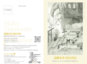 2025年11月1日(土)~11月9日(日)10:00~17:00 会期中無休ギャラリーART G ▶入場無料▶銅版画30点、豆版画40点展示▶高橋未歩カレンダー2026プレゼント